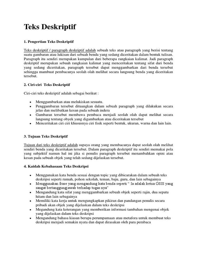 Teks deskripsi biasanya menjelaskan seseorang, benda, sebuah peristiwa, . Kalau orang bisa namanya, siapanya penulis dan lain lain. Berisi gambaran umum dari objek yang akan dibahas. Pengertian teks deskripsi, ciri, struktur, jenis dan contohnya. Teks deskripsi merupakan sebuah teks atau paragraf yang berisi tentang pemaparan atau penggambaran mengenai suatu objek secara jelas dan .